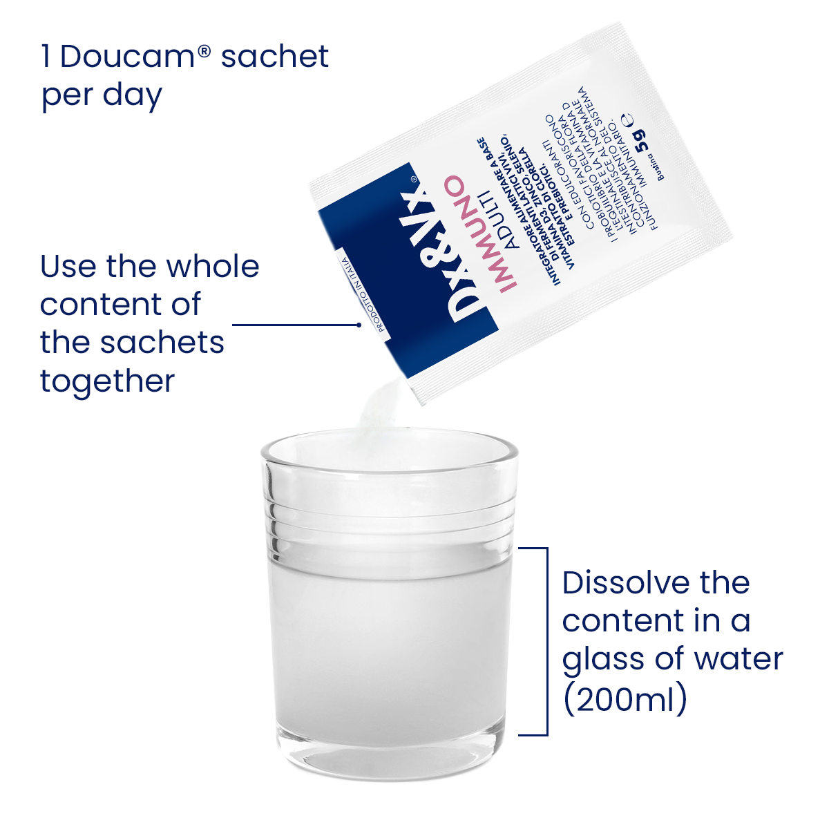 IMMUNO contains 28 Duocam sachets; it is designed for daily intake over a 28-day cycle.
