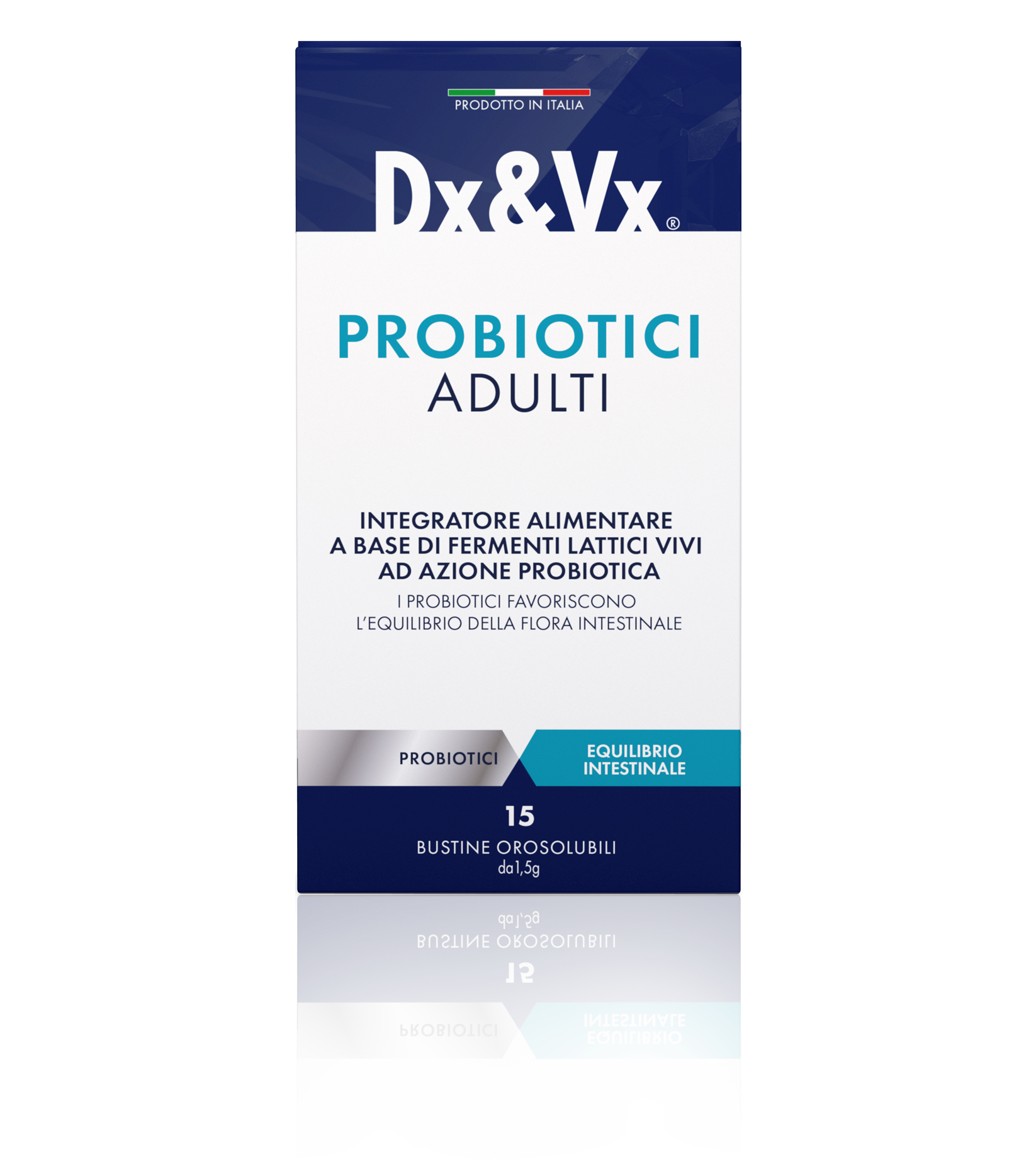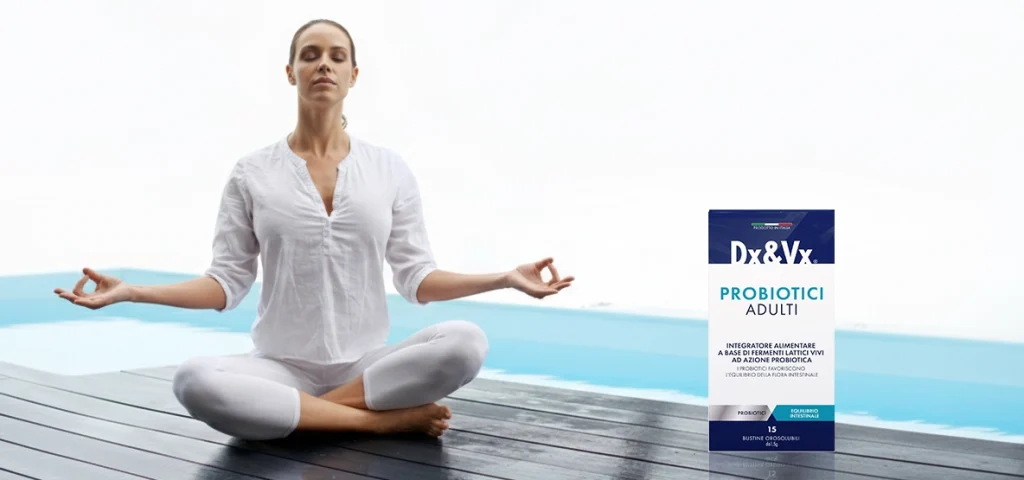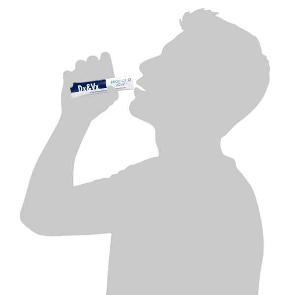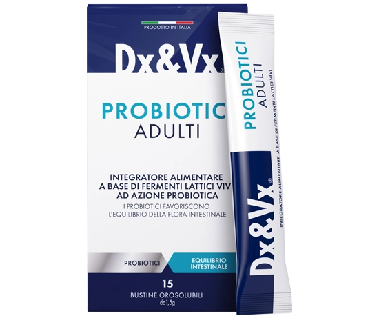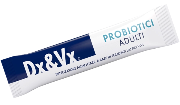 Dx&Vx Probiotici Adulti is a food supplement based on live lactic ferments with probiotic action (Lacticaseibacillus paracasei Lpc-37, Lacticaseibacillus rhamnosus KP GG, Bifidobacterium longum BB536).